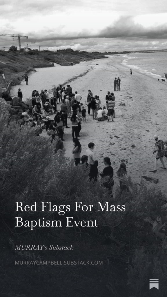 Red Flags for Mass Baptism Event April 2, 2026 / MurrayCampbell A mass baptism event is being organised this Easter in Frankston (Melbourne). Before we jump into the water there are red flags to take consider. Click on the pic to head to the substack article Share this: Share on X (Opens in new window) X Share on Facebook (Opens in new window) Facebook Email a link to a friend (Opens in new window) Email Print (Opens in new window) Print Like Loading...