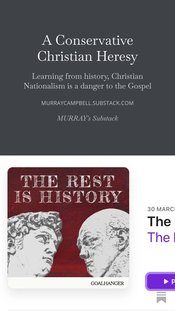 A Conservative Christian Heresy April 9, 2026 / MurrayCampbell Dominic Sandbrook and Tom Holland’s recent series on the KK on ‘The Rest is History’ podcasts sounds an ominous dissonance. A Conservative Christian Heresy. Click on the graphic to read my latest substack Share this: Share on X (Opens in new window) X Share on Facebook (Opens in new window) Facebook Email a link to a friend (Opens in new window) Email Print (Opens in new window) Print Like Loading...