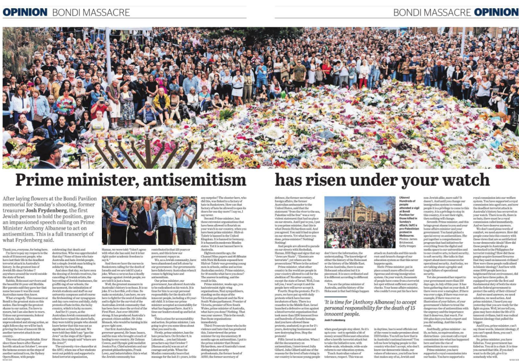 Josh Frydenberg addressed the media and onlookers at Bondi Beach yesterday. The former Federal Treasurer is a Jewish Australian, and one who has been raising the alarm over anti-semitism these past two years. Yesterday, he delivered a must-watch speech. I wouldn’t be surprised if Mr Frydenberg’s words are remembered in 100 years, either as a catalyst for change or as the warning that went unheeded. It wasn’t political grandstanding. There was pain in his voice, as well as anger and frustration. He gave a clarion call for Australia to rid herself of this ancient evil: antisemitism.