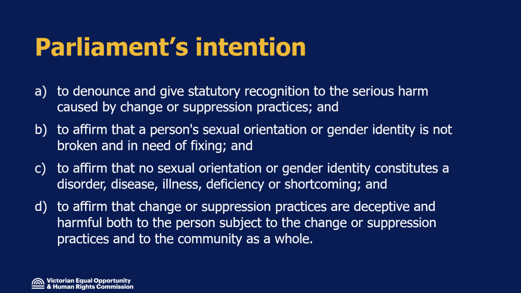 The laws empower the Victorian Equal Opportunity and Human Rights Commission (VEOHRC) to consider and respond to reports of change or suppression practices from any person, as well as launch investigations where there is evidence of serious or systemic change or suppression practices.”